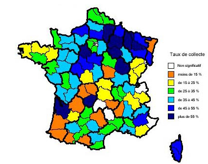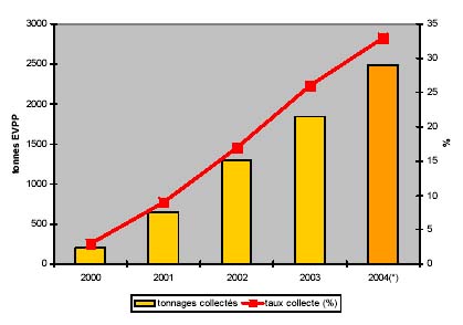 - Le taux de collecte EVPP dépasse les 30% en 2004. Le tonnage total collecté en 2004 est d’environ 2.500 tonnes, soit une progression de plus de 40% par rapport à 2003 (1784 tonnes), - L’analyse des résultats par département confirme cependant une très forte hétérogénéité de résultats selon les territoires et les distributeurs (taux de collecte compris entre 10 et 60%) :